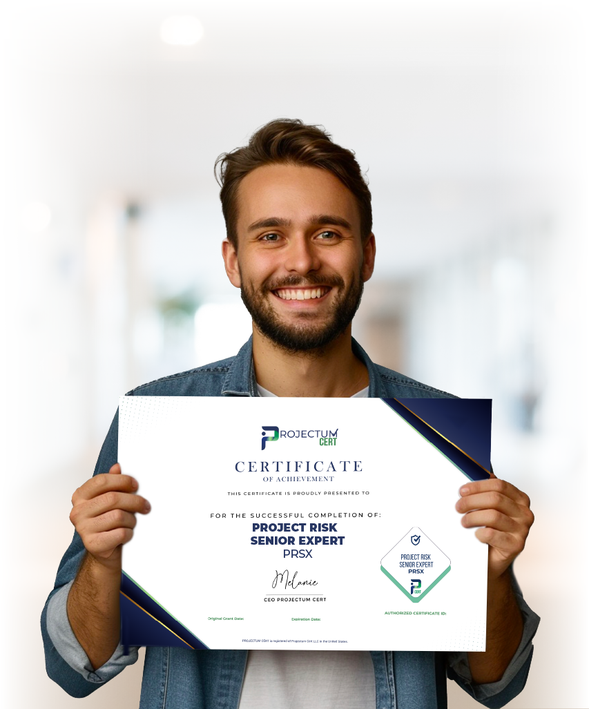 O Risco do Projeto Sênior especialista (PRSX), a certificação permite demonstrar suas habilidades em gerenciamento de risco, no âmbito de projectos, melhorar o seu perfil profissional e o aumento de oportunidades de emprego em setores como a construção, tecnologia, finanças e manufatura.